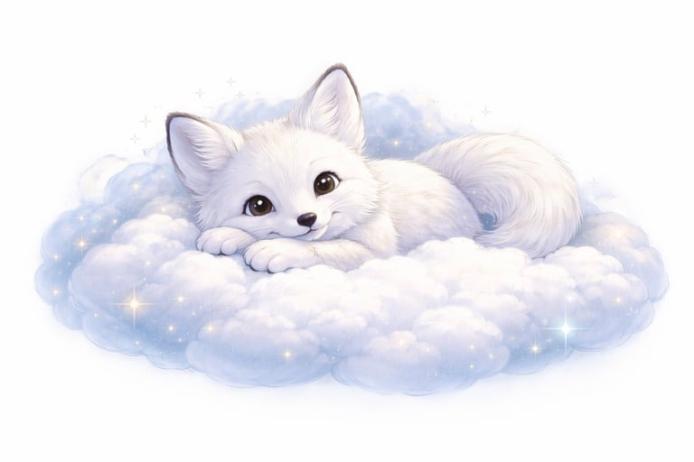einen kleinen weißen Fuchs, der fröhlich über die Wolken tanzt.